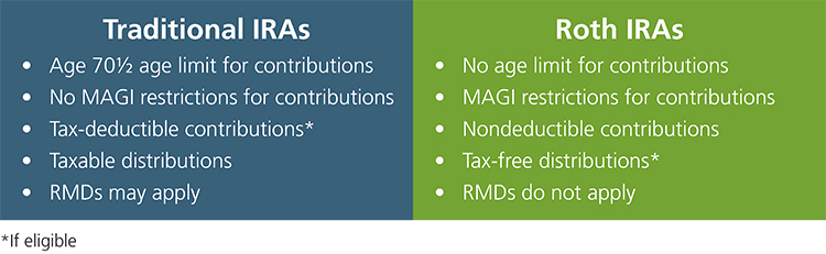 Successful IRA programs depend on staff being able to talk intelligently—without giving tax advice—about IRAs, particularly about the differences between Traditional and Roth IRAs. The differences fall into two main categories: contributions and distributions.